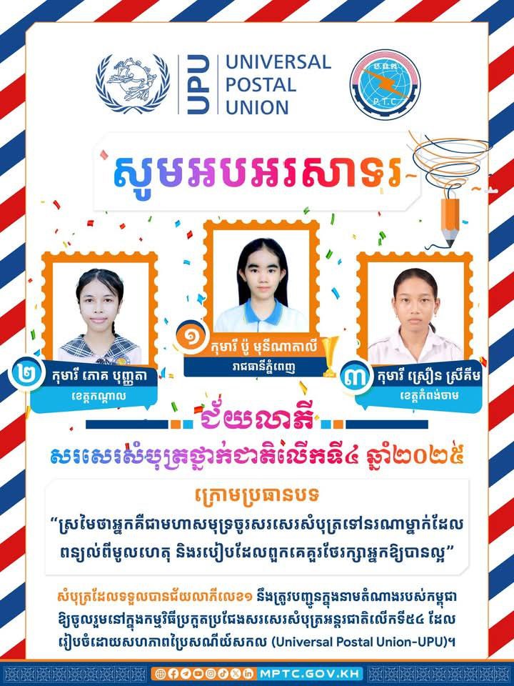 AKP ភ្នំពេញ ថ្ងៃទី០៧ ខែឧសភា ឆ្នាំ២០២៥-- ក្រសួងប្រៃសណីយ៍ និងទូរគមនាគមន៍ កាលពីថ្ងៃទី០៦ ខែឧសភា ឆ្នាំ២០២៥ បានជូនដំណឹងដល់សាធារណជន នាយកសាលា លោកគ្រូ អ្នកគ្រូ និងសិស្សានុសិស្ស ថា ក្រោយពីគណៈកម្មការបានវាយតម្លៃយ៉ាងយកចិត្តទុកដាក់លើសំណេរសំបុត្ររបស់បេក្ខជនសរុបចំនួន ២ ១០២ ដែលបានផ្ញើមកចូលរួមប្រកួតប្រជែងក្នុងកម្មវិធីប្រកួតប្រជែងសរសេរសំបុត្រថ្នាក់ជាតិលើកទី៤ ឆ្នាំ២០២៥ គណៈកម្មការបានសម្រេចជ្រើសរើសសំបុត្ររបស់បេក្ខជនចំនួន១០រូប ជាបេក្ខជនជាប់ជ័យលាភីក្នុងដំណាក់កាលទី១ ដោយសំណេរទាំងនេះមានខ្លឹមសារល្អ និងទទួលបានពិន្ទុខ្ពស់។