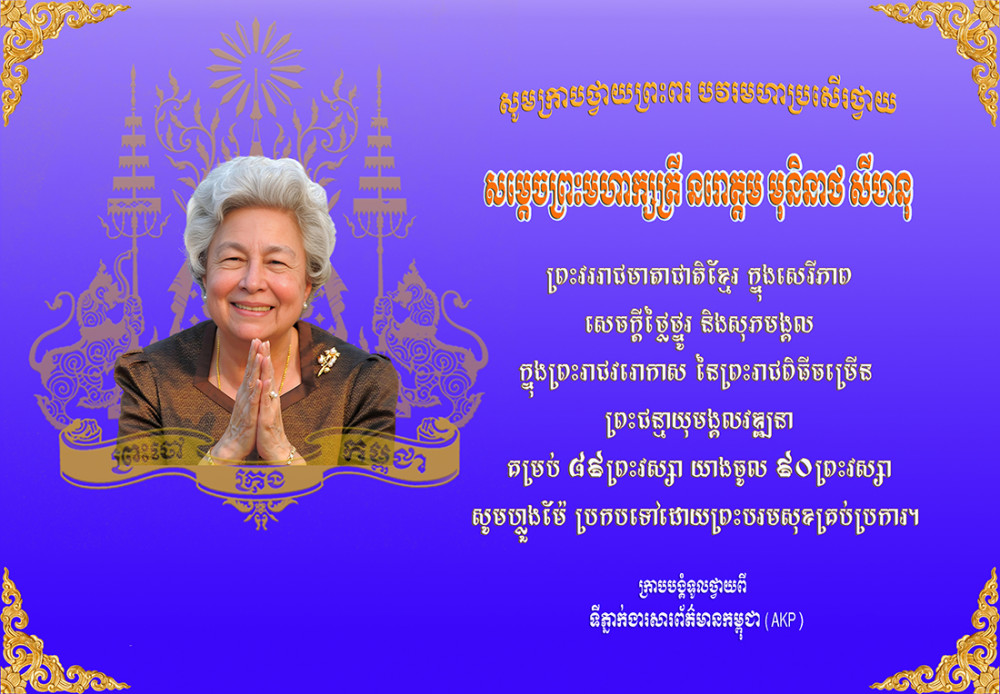 សូមក្រាបបង្គំទូលថ្វាយព្រះពរ បវរមហាប្រសើរថ្វាយសម្តេចព្រះមហាក្សត្រី នរោត្តម មុនិនាថ សីហនុ ក្នុងព្រះរាជពិធីចម្រើនព្រះជន្មាយុមង្គលវឌ្ឍនា គម្រប់ ៨៩ព្រះវស្សា យាងចូល ៩០ព្រះវស្សា