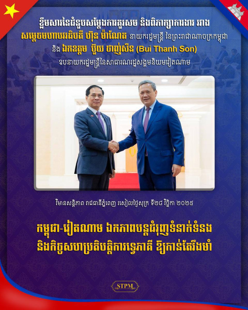 AKP ភ្នំពេញ ថ្ងៃទី២៨ ខែវិច្ឆិកា ឆ្នាំ២០២៥–សម្តេចមហាបវរធិបតី ហ៊ុន ម៉ាណែត នាយករដ្ឋមន្ត្រី នៃព្រះរាជាណាចក្រកម្ពុជា នារសៀលថ្ងៃទី២៨ ខែវិច្ឆិកា ឆ្នាំ២០២៥ បានអនុញ្ញាតឱ្យ ឯកឧត្តម Bui Thanh Son ឧបនាយករដ្ឋមន្ត្រីនៃសាធារណរដ្ឋសង្គមនិយមវៀតណាម ចូលជួបសម្ដែងការគួរសម និងពិភាក្សាការងារ នៅវិមានសន្តិភាព។