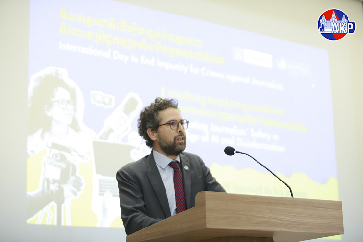 ឯកឧត្តម ទេព អស្នារិទ្ធ អនុរដ្ឋលេខាធិការ និងជាអ្នកនាំពាក្យក្រសួងព័ត៌មាន អញ្ជើញចូលរូមជាអធិបតីសិក្ខាសាលារំលឹក ខួបទិវាអន្តរជាតិដើម្បីបញ្ចប់និទណ្ឌភាព ចំពោះឧក្រិដ្ឋកម្ម ប្រឆាំងនឹងអ្នកសារព័ត៌មាន នារសៀលថ្ងៃទី០៤ ខែធ្នូ ឆ្នាំ២០២៥ នៅសណ្ឋាគារ Bai tong Hotel & Resort រាជធានីភ្នំពេញ។