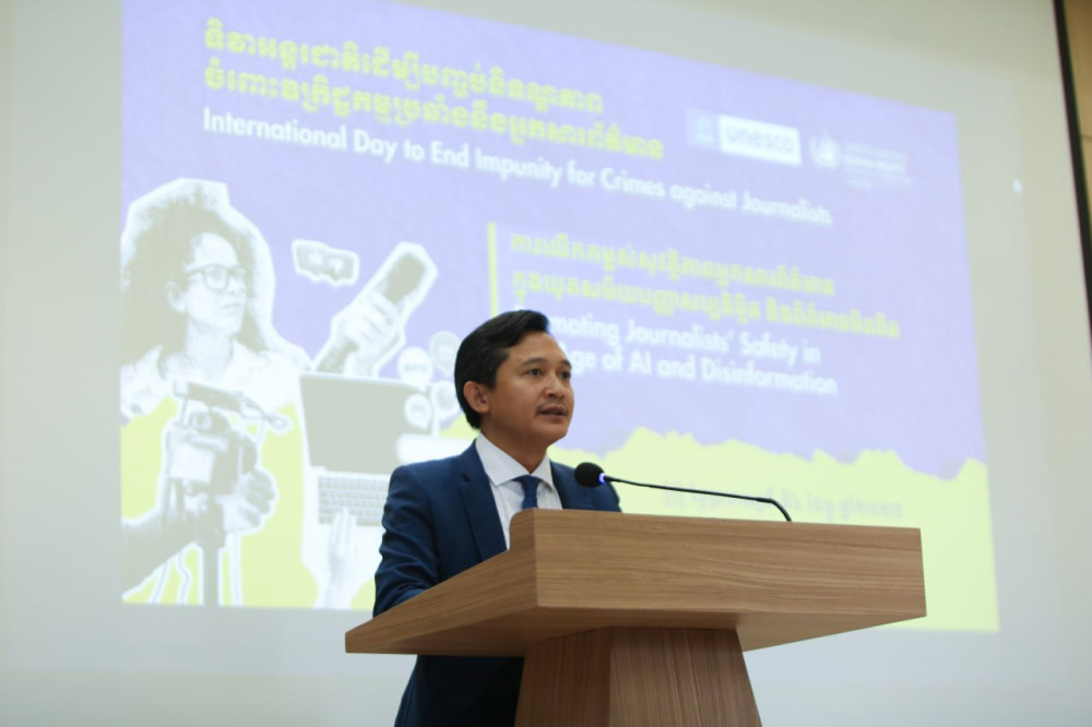AKP ភ្នំពេញ ថ្ងៃទី៥ ខែធ្នូ ឆ្នាំ២០២៥--ឯកឧត្ដម ទេព អស្នារិទ្ធ អនុរដ្ឋលេខាធិការ និងជាអ្នកនាំពាក្យក្រសួងព័ត៌មានបានលើកឡើងថា ការតម្រូវឱ្យអ្នកសារព័ត៌មានទាំងអស់អនុវត្តន៍វិជ្ជាជីវៈរបស់ខ្លួនដោយអនុលោមតាមរដ្ឋធម្មនុញ្ញ ច្បាប់ស្តីពីរបបសារព័ត៌មាន ធម្មនុញ្ញវិជ្ជាជីវៈសារព័ត៌មាន ព្រមទាំងច្បាប់និងលិខិតបទដ្ឋានជាធរមាន ដើម្បីការពារសុវត្ថិភាពក្នុងពេលបំពេញការងារ កុំឱ្យការអនុវត្តសេរីភាពប្រាសចាកក្រមសីលធម៌ ទៅរំលោភបំពានលើសិទ្ធិឯកជន កិត្តិយស សេចក្តីថ្លៃថ្នូររបស់បុគ្គល ឬប៉ះពាល់ដល់សន្តិសុខជាតិ និងសណ្ដាប់ធ្នាប់សាធារណៈ។ ការលើកឡើងរបស់ឯកឧត្តមអ្នកនាំពាក្យក្រសួងព័ត៌មានថ្លែងបែបនេះ ក្នុងឱកាសទិវាអន្តរជាតិបញ្ចប់វប្បធម៌និទណ្ឌភាពចំពោះឧក្រិដ្ឋកម្មប្រឆាំងនឹងអ្នកសារព័ត៌មាន រៀបចំឡើងដោយការិយាល័យឧត្ដមស្នងការអង្គការសហប្រជាជាតិទទួលបន្ទុកសិទ្ធិមនុស្ស (OHCHR) និងអង្គការយូណេស្កូ (UNESCO) នារសៀលថ្ងៃទី៤ ខែធ្នូ ឆ្នាំ២០២៥ នៅរាជធានីភ្នំពេញ។