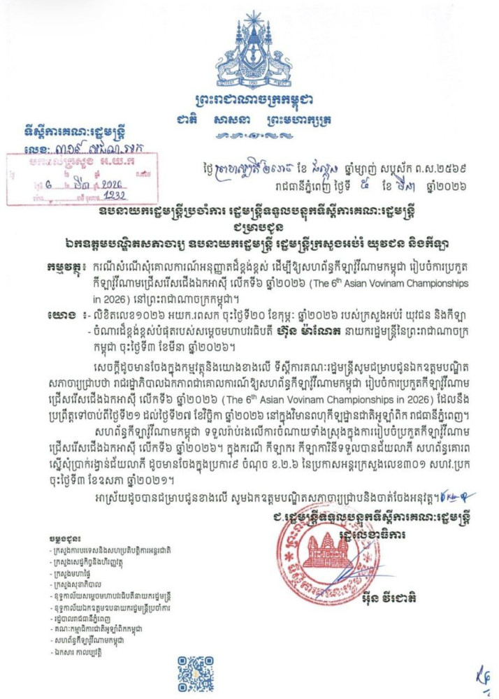 AKP ភ្នំពេញ ថ្ងៃទី១១ ខែមីនា ឆ្នាំ២០២៦--រាជរដ្ឋាភិបាលកម្ពុជាបានអនុញ្ញាតជាគោលការណ៍ឱ្យសហព័ន្ធកីឡាវ៉ូវីណាមកម្ពុជាទទួលរៀបចំធ្វើម្ចាស់ផ្ទះ ការប្រកួតកីឡាវ៉ូវីណាមជ្រើសរើសជើងឯកអាស៊ី លើកទី៦ ឆ្នាំ២០២៦ បន្ទាប់ពីទទួលបានការគាំទ្រ និងអនុញ្ញាតជាផ្លូវការពីសហព័ន្ធកីឡាវ៉ូវីណាមពិភពលោក។