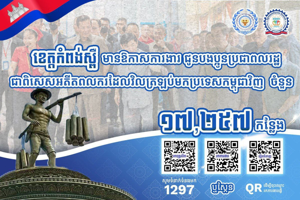 ក្រសួងការងារ៖ ខេត្តកំពង់ស្ពឺ មានឱកាសការងារជិត ២ម៉ឺនកន្លែង កំពុងរង់ចាំអតីតពលករត្រឡប់មកពីថៃ និងអ្នកកំពុងស្វែងរកការងារធ្វើ