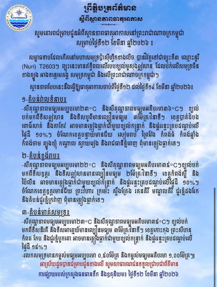 កម្ពុជានឹងរងឥទ្ធិពលព្យុះទី៣ឈ្មោះនូរី (Nuri) T2603 និងប៉ះពាល់នៅតាមបណ្ដាខេត្ដជាប់មាត់សមុទ្រ និងជួរភ្នំ ចាប់ពីថ្ងៃទី១២-១៤ ខែមីនា ២០២៦