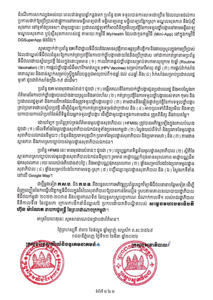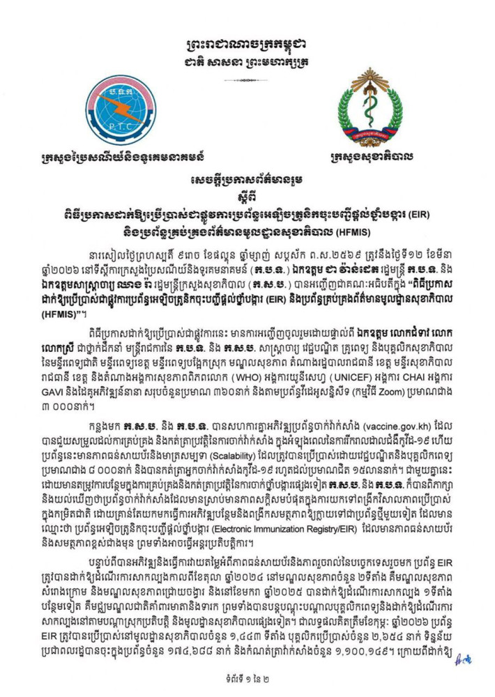 ក្រសួងប្រៃសណីយ៍ និងក្រសួងសុខាភិបាល ប្រកាសដាក់ឱ្យប្រើប្រាស់ប្រព័ន្ធអេឡិចត្រូនិកចុះបញ្ជីផ្តល់ថ្នាំបង្ការ (EIR) និងប្រព័ន្ធគ្រប់គ្រងព័ត៌មានមូលដ្ឋានសុខាភិបាល (HFMIS)