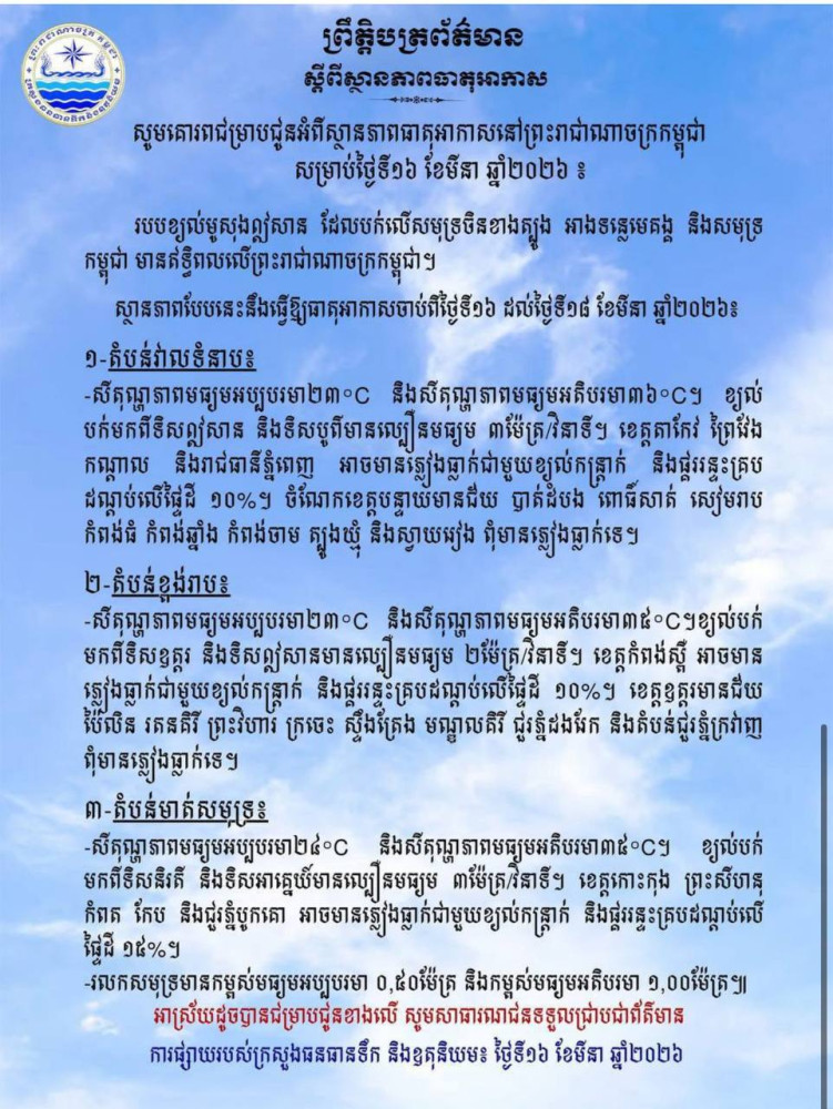 នេះបើតាមការប្រកាស ជូនដំណឹង របស់ក្រសួងធនធានទឹក និងឧតុនិយម នៅព្រឹកថ្ងៃចន្ទទី១៦ ខែមីនា ឆ្នាំ២០២៦ ស្តីពីស្ថានភាពធាតុអាកាសនៅព្រះរាជាណាចក្រកម្ពុជា ខណៈរបបខ្យល់មូសុងឦសាន ដែលបក់លើសមុទ្រចិនខាងត្បូង អាងទន្លេមេគង្គ និងសមុទ្រកម្ពុជា មានឥទ្ធិពលលើព្រះរាជាណាចក្រកម្ពុជា។