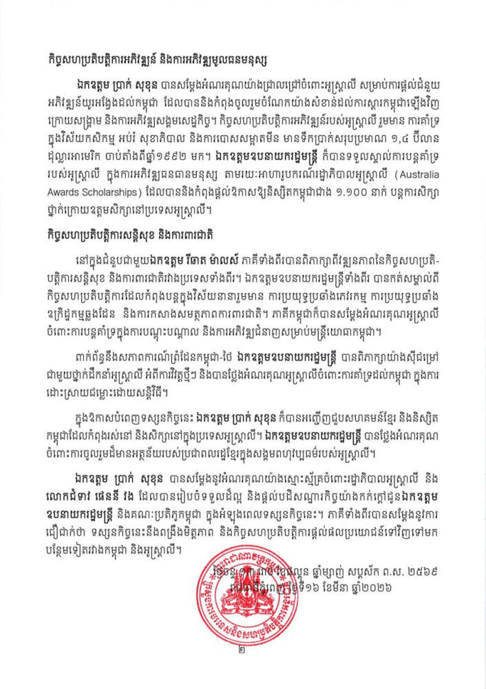 លទ្ធផលនៃដំណើរទស្សនកិច្ចរបស់ឯកឧត្តមឧបនាយករដ្ឋមន្ត្រី ប្រាក់ សុខុន នៅប្រទេសអូស្ត្រាលី