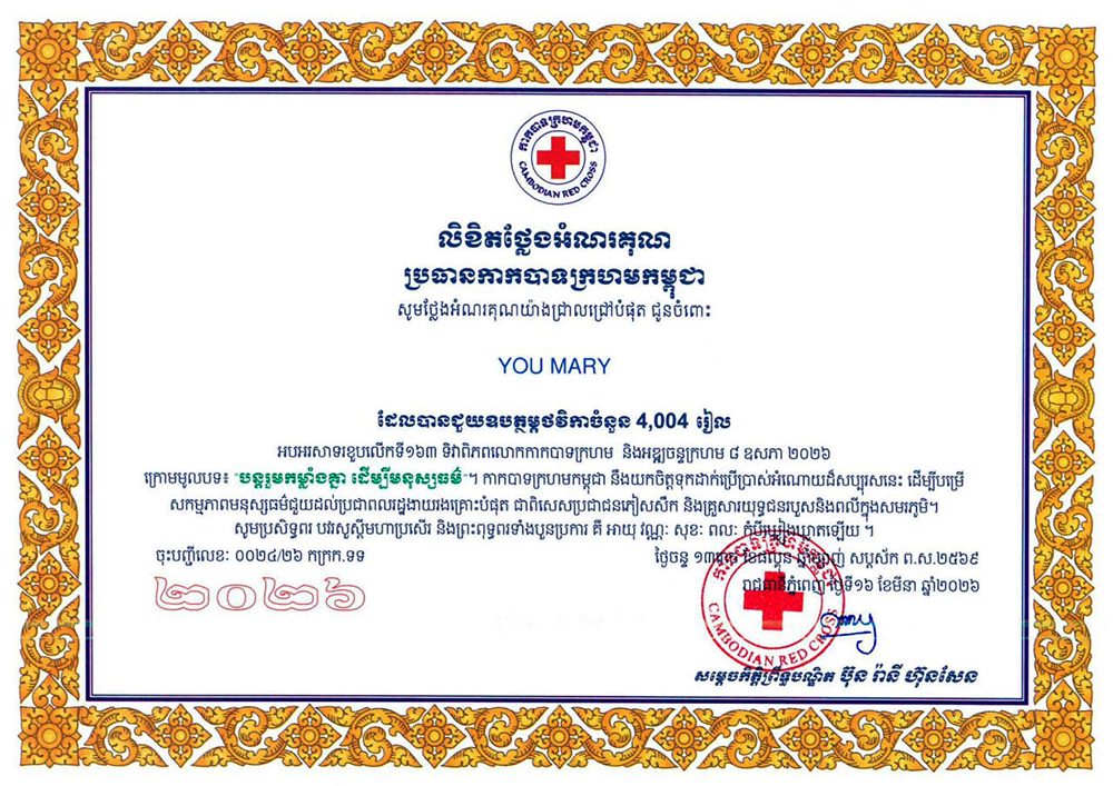 YOU MARY ឧបត្ថម្ភថវិកា 4,004 រៀល ជូនកាកបាទក្រហមកម្ពុជា ក្នុងឱកាសខួបលើកទី១៦៣ ទិវា ៨ ឧសភា ឆ្នាំនេះ ក្រោមមូលបទ«បន្តរួមកម្លាំងគ្នា ដើម្បីមនុស្សធម៌»...!!