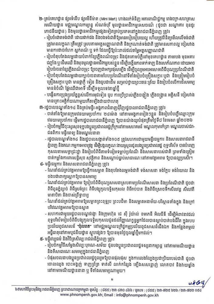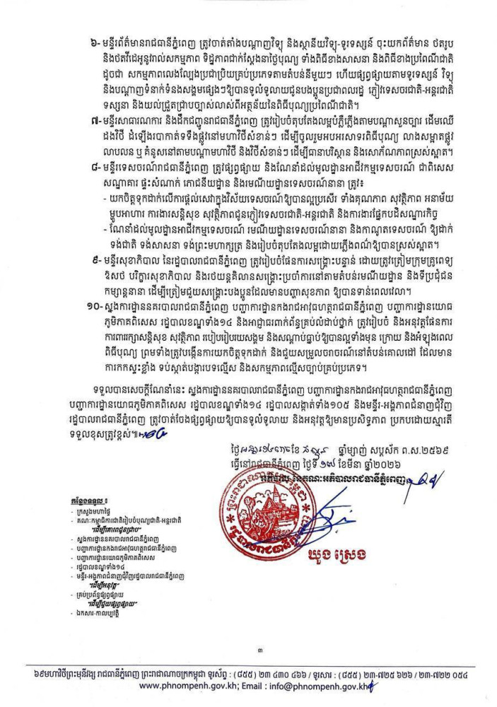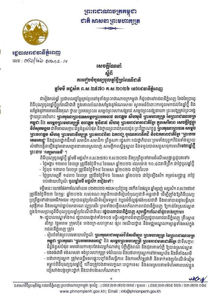រដ្ឋបាលរាជធានីភ្នំពេញណែនាំស្តីពីការរៀបចំបុណ្យចូលឆ្នាំថ្មីប្រពៃណីជាតិឆ្នាំមមី អដ្ឋស័ក ព.ស.២៥៧០ គ.ស.២០២៦ នៅរាជធានីភ្នំពេញ