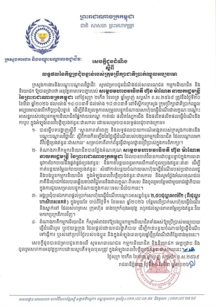 សេចក្តីជូនដំណឹង ស្តីពីលទ្ធផលនៃកិច្ចប្រជុំបន្ទាន់របស់ក្រុមប្រឹក្សាជាតិប្រាក់ឈ្នួលអប្បបរមា