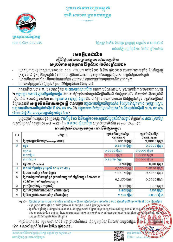 ជាមួយគ្នានេះ ដោយផ្អែកតាមសភាពការណ៍ និងថ្លៃប្រេងឥន្ទន:បន្តកេីនឡេីងនៅទីផ្សារអន្តរជាតិ រាជរដ្ឋាភិបាលបានដាក់ចេញនូវវិធានការអន្តរាគមន៍បន្ថែម កាលពីថ្ងៃ២០ ខែមីនា ឆ្នាំ២០២៦ ដែលរួមមាន៖