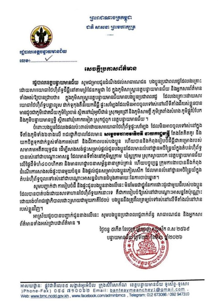 សេចក្តីប្រកាសព័ត៌មាន របស់ រដ្ឋបាលខេត្តបន្ទាយមានជ័យ ពាក់ព័ន្ធនឹងការរៀបចំជម្រកបណ្តោះអាសន្ន សម្រាប់បងប្អូនភៀសសឹកស្នាក់នៅ