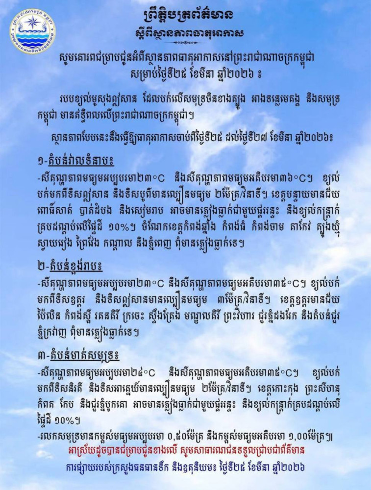 AKP ភ្នំពេញ ថ្ងៃទី២៥ ខែមីនា ឆ្នាំ២០២៦—ស្ថានភាពអាកាសធាតុ៣ថ្ងៃអាចមានភ្លៀងធ្លាក់ជាមួយផ្គររន្ទះ និងខ្យល់កន្ត្រាក់គ្របដណ្តប់លើផ្ទៃដី១០ភាគរយ នៅព្រះរាជាណាចក្រកម្ពុជា នេះបើតាម សេចក្ដីជូនដំណឹង របស់ ក្រសួងធនធានទឹក នៅថ្ងៃទី២៥ ខែមីនា ឆ្នាំ២០២៦ ស្តីពីស្ថានភាពធាតុអាកាសនៅព្រះរាជាណាចក្រកម្ពុជា ខណៈរបបខ្យល់មូសុងឦសាន ដែលបក់លើសមុទ្រចិនខាងត្បូង អាងទន្លេមេគង្គ និងសមុទ្រ កម្ពុជាមានឥទ្ធិពលលើព្រះរាជាណាចក្រកម្ពុជា។