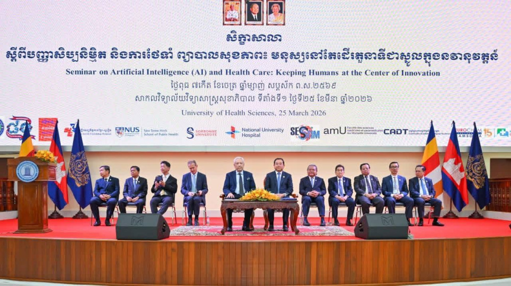 AKP ភ្នំពេញ ថ្ងៃទី២៥ ខែមីនា ឆ្នាំ២០២៦-- ឯកឧត្តមសាស្រ្តាចារ្យ ឆែម គាតរិទ្ធី ទេសរដ្ឋមន្រ្តី និងជាប្រធានក្រុមប្រឹក្សាសេដ្ឋកិច្ចសង្គម និងវប្បធម៌ និងឯកឧត្តមសាស្រ្តាចារ្យ ឈាង រ៉ា រដ្ឋមន្រ្តីក្រសួងសុខាភិបាល បានអញ្ជើញជាសហអធិបតីក្នុងពិធីបើកសិក្ខាសាលាស្តីពី បញ្ញាសិប្បនិម្មិត និងការថែទាំ ព្យាបាលសុខភាព៖ មនុស្សនៅតែដើរតួនាទីស្នូលក្នុងនវានុវត្តន៍ ដែលរៀបចំឡើងនៅ សាកលវិទ្យាល័យ វិទ្យាសាស្រ្តសុខាភិបាល នាថ្ងៃទី២៥ ខែមីនា ឆ្នាំ២០២៦។