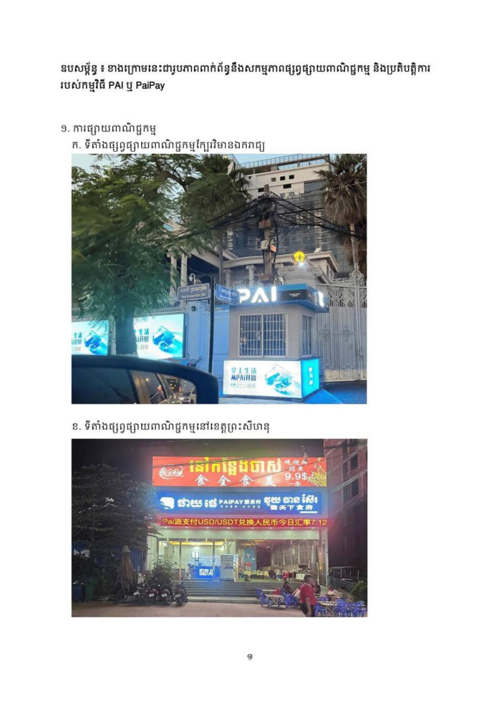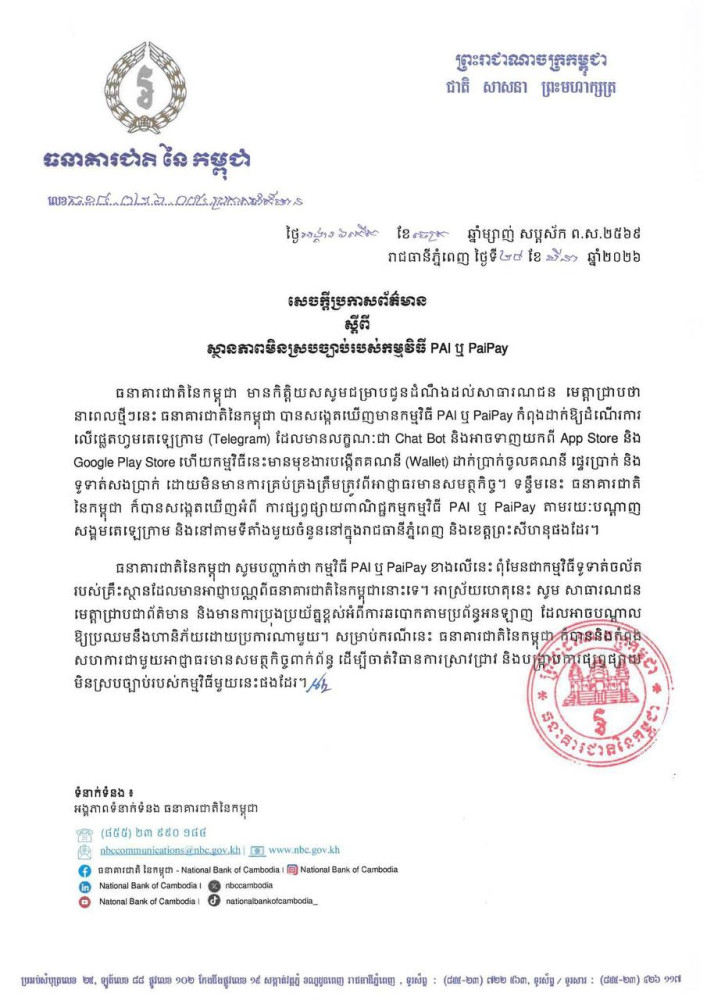 យោងតាមសេចក្តីប្រកាសព័ត៌មានស្តីពី ស្ថានភាពមិនស្របច្បាប់របស់កម្មវិធី PAI ឬ PaiPay ដែលបានចេញផ្សាយនៅថ្ងៃនេះថា ធនាគារជាតិនៃកម្ពុជា មានកិត្តិយសសូមជម្រាបជូនដំណឹងដល់សាធារណជន មេត្តាជ្រាបថា នាពេលថ្មីៗនេះ ធនាគារជាតិនៃកម្ពុជា បានសង្កេតឃើញមានកម្មវិធី PAI ឬ PaiPay កំពុងដាក់ឱ្យដំណើរការ លើផ្លេតហ្វមតេឡេក្រាម (Telegram) ដែលមានលក្ខណៈជា Chat Bot និងអាចទាញយកពី App Store និង Google Play Store ហើយកម្មវិធីនេះមានមុខងារបង្កើតគណនី (Wallet) ដាក់ប្រាក់ចូលគណនី ផ្ទេរប្រាក់ និង ទូទាត់សងប្រាក់ ដោយមិនមានការគ្រប់គ្រងត្រឹមត្រូវពីអាជ្ញាធរមានសមត្ថកិច្ច។