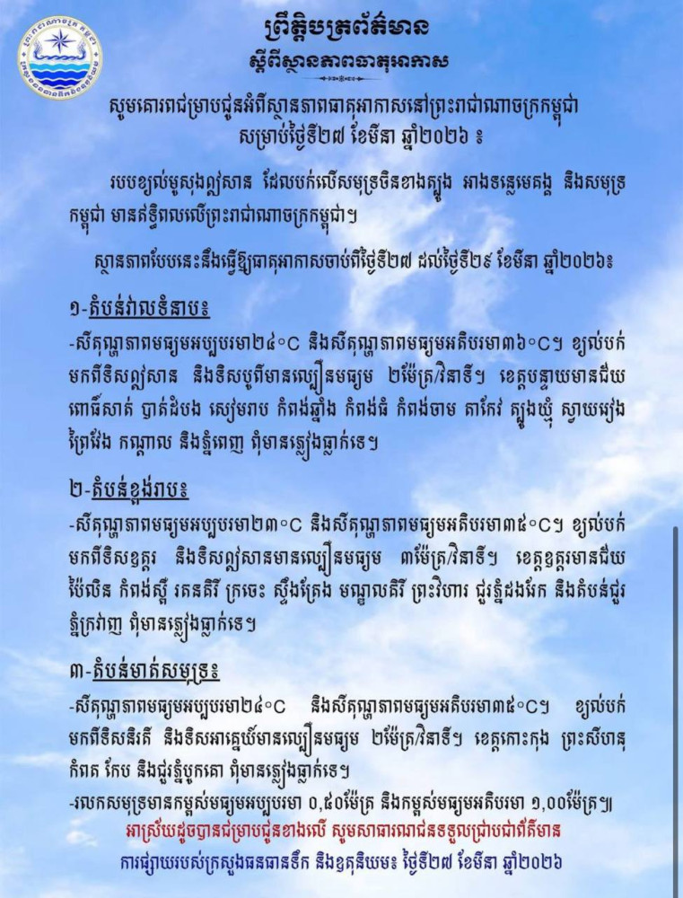 AKP ភ្នំពេញ ថ្ងៃទី២៧ ខែមីនា ឆ្នាំ២០២៦ -- ក្រសួងធនធានទឹក និងឧតុនិយម បានចេញសេចក្ដីជូនដំណឹងស្តីពីស្ថានភាពធាតុអាកាសនៅព្រះរាជាណាចក្រកម្ពុជា ខណៈកម្តៅអាចនឹងឡើងជាមួយរបបខ្យល់មូសុងឦសានស្ងួត ដែលបក់លើសមុទ្រចិនខាងត្បូង អាងទន្លេមេគង្គ និងសមុទ្រកម្ពុជា ធ្វើឱ្យមានឥទ្ធិពលលើព្រះរាជាណាចក្រកម្ពុជា នាថ្ងៃទី២៧ ខែមីនា ឆ្នាំ២០២៦នេះ។
