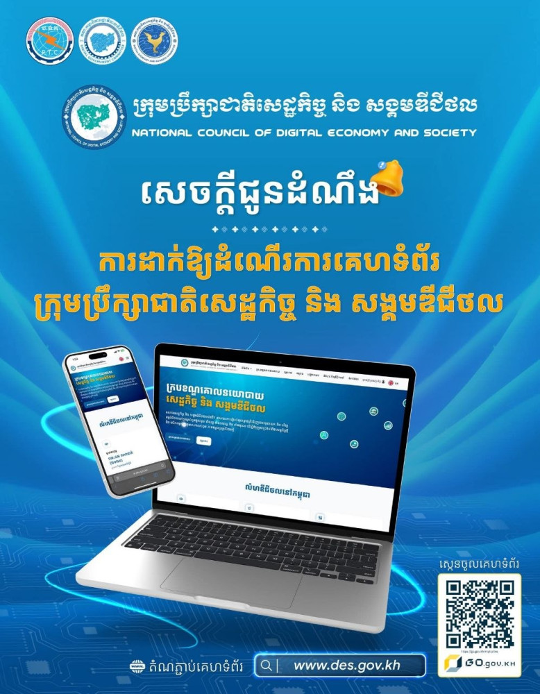 AKP ភ្នំពេញ ថ្ងៃទី២៧ ខែមីនា ឆ្នាំ២០២៦-- ក្រសួងប្រៃសណីយ៍ និងទូរគមនាគមន៍ (ក.ប.ទ.) នៅថ្ងៃទី២៧ ខែមីនា ឆ្នាំ២០២៦ បានជម្រាបជូនសាធារណជនទាំងអស់ឱ្យបានជ្រាបថា ក្នុងកិច្ចខិតខំប្រឹងប្រែងជំរុញការអនុវត្ត “ក្របខណ្ឌគោលនយោបាយសេដ្ឋកិច្ច និងសង្គមឌីជីថលកម្ពុជា ២០២១-២០៣៥” និងដើម្បីលើកកម្ពស់ការយល់ដឹងអំពីការប្រើប្រាស់បច្ចេកវិទ្យាឌីជីថល ក.ប.ទ. បានរៀបចំដាក់ឱ្យដំណើរការជាផ្លូវការគេហទំព័រក្រុមប្រឹក្សាជាតិសេដ្ឋកិច្ច និងសង្គមឌីជីថលដែលមានអាសយដ្ឋាន www.des.gov.kh ចាប់ពីថ្ងៃនេះតទៅ។