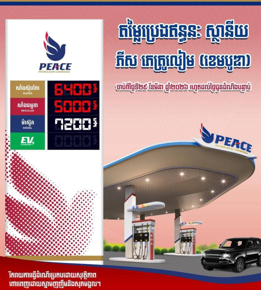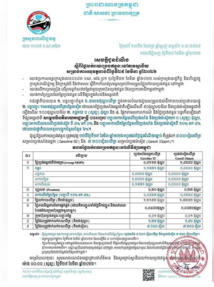 យោងលើការព្រមព្រៀង ស្តីពីរូបមន្តកំណត់តម្លៃជាមួយក្រុមហ៊ុនប្រេងឥន្ធនៈដែលប្រកបអាជីវកម្មនៅកម្ពុជា យោងការប្រែប្រួលនៃតម្លៃប្រេងឥន្ធនៈលើទីផ្សារក្នុងតំបន់និងអន្តរជាតិ រាជរដ្ឋាភិបាល បាន ១.បន្តបញ្ចុះ ៦,៥សេនដុល្លារ/លីត្រ ក្នុងគោលបំណងជួយសម្រួលដល់ជីវភាពរបស់ប្រជាពលរដ្ឋ ។ ២.បន្តបញ្ចុះ ១សេនដុល្លារ/លីត្របន្ថែមទៀត ដោយសារថ្លៃប្រេងសាំងអន្តរជាតិឡើងលើសពី ៩០ដុល្លារ/បារ៉ែល និងប្រេងម៉ាស៊ូតអន្តរជាតិ ឡើងលើស ១០០ដុល្លារ/បារ៉ែល។ ៣.ពន្ធគយ ០ (សូន្យ) ដុល្លារ និង ៤.ផ្អែកតាមសភាពការណ៍ និងថ្លៃប្រេងឥន្ធនៈបន្តកើនឡើងនៅទីផ្សារអន្តរជាតិ សម្តេចធិបតីនាយករដ្ឋមន្ត្រី បានសម្រេចបញ្ចុះអាករបន្ថែមលើប្រេងសាំង និងបញ្ចុះអាករពិសេសលើប្រេងម៉ាស៊ូត ពី ៤% មក ០% និង បញ្ចុះអាករលើតម្លៃបន្ថែមលើប្រេងសាំង និងប្រេងម៉ាស៊ូតពី ១០% មក ៤% ដោយរាជរដ្ឋាភិបាលទទួលបន្ទុកជំនួសចំនួន ៦%។ ដូច្នេះថ្លៃលក់រាយប្រេងឥន្ធនៈត្រូវអនុវត្ត ចាប់ពីថ្ងៃទី២៩ ខែមីនា ឆ្នាំ២០២៦ រហូតដល់ថ្ងៃជូនដំណឹងបន្ទាប់ គឺ ៥.០០០រៀល/លីត្រ សម្រាប់ប្រេងសាំងធម្មតា (Gasoline 92) និង ៧.២០០រៀល/លីត្រ សម្រាប់ប្រេងម៉ាស៊ូត (Gasoil 10ppm)៕