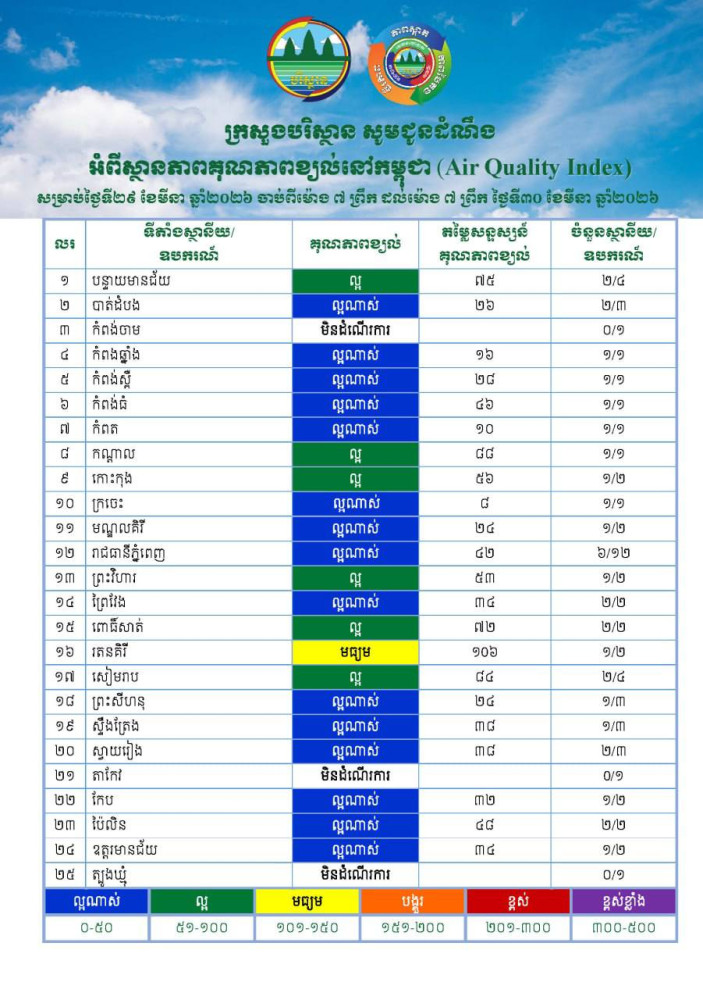 ព័ត៌មានស្តីពីការប្រែប្រួលគុណភាពខ្យល់ ទទួលបាន ពីការដំឡើងឧបករណ៍ត្រួតពិនិត្យ៖ គិតត្រឹមខែមករា ឆ្នាំ ២០២៦ ក្រសួងមានស្ថានីយត្រួតពិនិត្យគុណភាពខ្យល់ចំនួន ៥៩ កន្លែង និងរថយន្តត្រួតពិនិត្យចល័តចំនួន ៣ គ្រឿង ។ ក្នុងនោះក្រសួងក៏បានដាក់ចេញវិធានការចាប់ពីឆ្នាំ ២០២៦ ដោយតម្រូវឱ្យរោងចក្រនានាដំឡើងឧបករណ៍វាស់គុណភាពខ្យល់ដោយស្វ័យប្រវត្តិផងដែរ ។