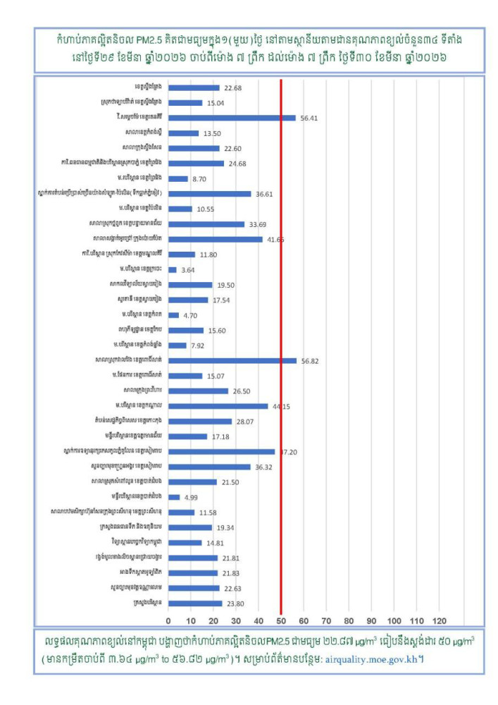 AKP ភ្នំពេញ ថ្ងៃទី៣០ ខែ មីនា ឆ្នាំ២០២៦--ក្រសួងបរិស្ថានបានចេញបញ្ជាក់ថា គុណភាពខ្យល់នៅក្នុងប្រទេសកម្ពុជាមិនមានការបំពុលនៅឡើយទេ បើទោះបីក្នុងរដូវប្រាំងនេះ អាកាសធាតុក្តៅ និងមានសភាពស្ងួតក៏ដោយ។ការបញ្ជាក់បែបនេះ ធ្វើឡើងបន្ទាប់ពីមានការផ្សព្វផ្សាយខុសពីការពិតរបស់វិទ្យុបារាំងអន្តរជាតិ ដែលបានយកប្រភពអន្តរជាតិ ដែលមិនបានឆ្លុះបញ្ចាំងពីការពិតនៃស្តង់ដារគុណភាពខ្យល់របស់ជាតិ ដែលគិតជាមធ្យម ៥០ មីក្រូក្រាមក្នុង១ម៉ែត្រគូបខ្យល់ (µg/m3 ) សម្រាប់កម្រិតភាគល្អិតនិចល PM2.5 ក្នុងរយៈពេល២៤ម៉ោង។
