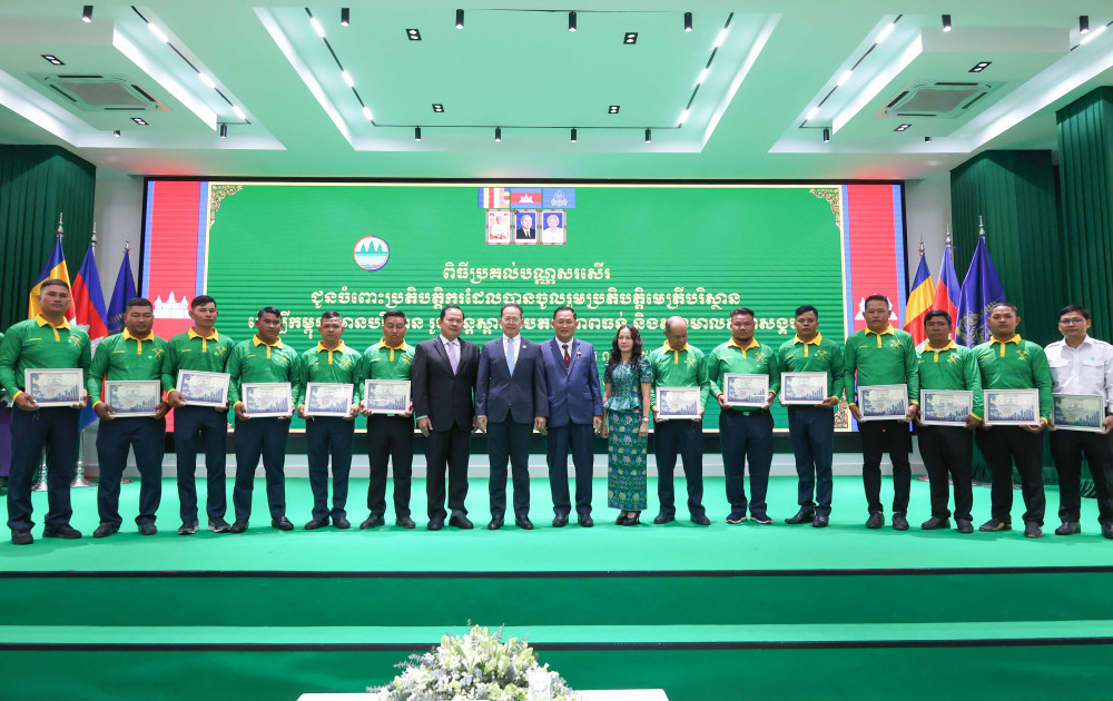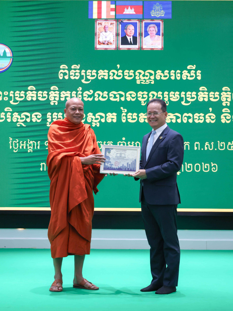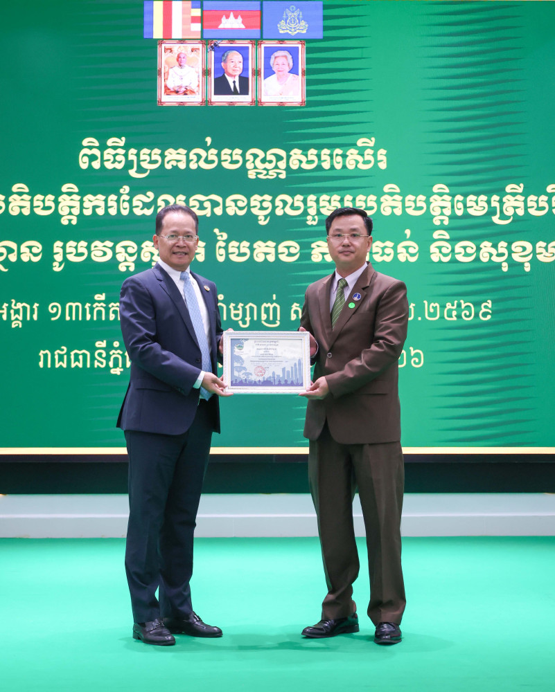 AKP ភ្នំពេញ ថ្ងៃទី៣១ ខែមីនា ឆ្នាំ២០២៦–ប្រតិបត្តិករចំនួន៥៤អង្គភាព/ស្ថាប័ន និងមន្ត្រីឧទ្យានុរក្សចំនួន៩៩រូប បានទទួលបណ្ណមេត្រីបរិស្ថាន ឆ្នាំ២០២៦ ដោយផ្ទាល់ពីឯកឧត្តមបណ្ឌិត អ៊ាង សុផល្លែត រដ្ឋមន្រ្តីក្រសួងបរិស្ថាន បន្ទាប់ពីក្រសួងបរិស្ថានពិនិត្យ និងវាយតម្លៃឃើញថាបានអនុវត្តសកម្មបានល្អ ឆ្លើយតបទៅនឹងយុទ្ធសាស្ត្រចក្រាវិស័យបរិស្ថានតាមរយៈការអនុវត្ត «ភាពស្អាត» «ភាពបៃតង» និង«ចីរភាព»ដើម្បីធានាបាននូវចីរភាពបរិស្ថាននៅកម្ពុជា។