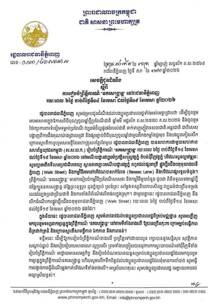 តាមសេចក្តីជូនដំណឹងរបស់រដ្ឋបាលរាជធានីភ្នំពេញ ស្តីពីការរៀបចំព្រឹត្តិការណ៍ “នគរសង្ក្រាន្ត” នៅរាជធានីភ្នំពេញ រយៈពេល ៦ថ្ងៃ ចាប់ពីថ្ងៃទី១៤ ខែមេសា ដល់ថ្ងៃទី១៩ ខែមេសា ឆ្នាំ២០២៦ ។