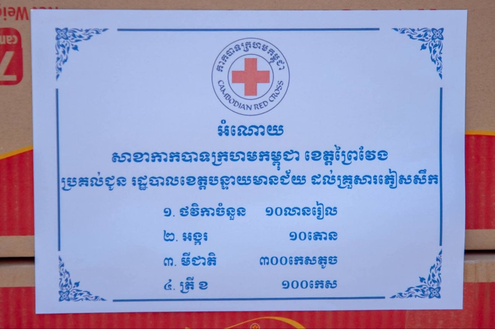 សកម្មភាពមនុស្សធម៌ និងអំណោយដែលទទួលបានឆ្លើយតបទៅនឹងតម្រូវការចាំបាច់ចំពោះមុខ របស់បងប្អូនប្រជាពលរដ្ឋដែលបានភៀសសឹក និងជម្លៀសខ្លួនពីលំនៅឋានមករស់នៅទីតាំងសុវត្ថិភាព ក្នុងភូមិសាស្ត្រខេត្តបន្ទាយមានជ័យ សាខាកាកបាទក្រហមកម្ពុជាខេត្តព្រៃវែង និងដៃគូសប្បុរសជន បានផ្តល់នូវការឧបត្ថម្ភរួមមាន៖ អំណោយពីសាខាកាកបាទក្រហមកម្ពុជាខេត្តព្រៃវែង ថវិកាចំនួន១០,០០០,០០០រៀល(ដប់លានរៀល) អង្ករចំនួន ១០,០០០ គីឡូក្រាម, មីជាតិចំនួន ៣០០ កេសតូច, ត្រីខចំនួន ១០០ កេស។ អំណោយពីអ្នកឧកញ៉ា សំអាង វឌ្ឍនៈ (អគ្គនាយកក្រុមហ៊ុន វឌ្ឍនៈ)អង្ករចំនួន ១,០០០ គីឡូក្រាម, ទឹកសុទ្ធវីអាក់ទីវ (V-Active) ចំនួន ១០០ កេស, ភេសជ្ជៈវីអាក់ទីវចំនួន ១០០ កេស។