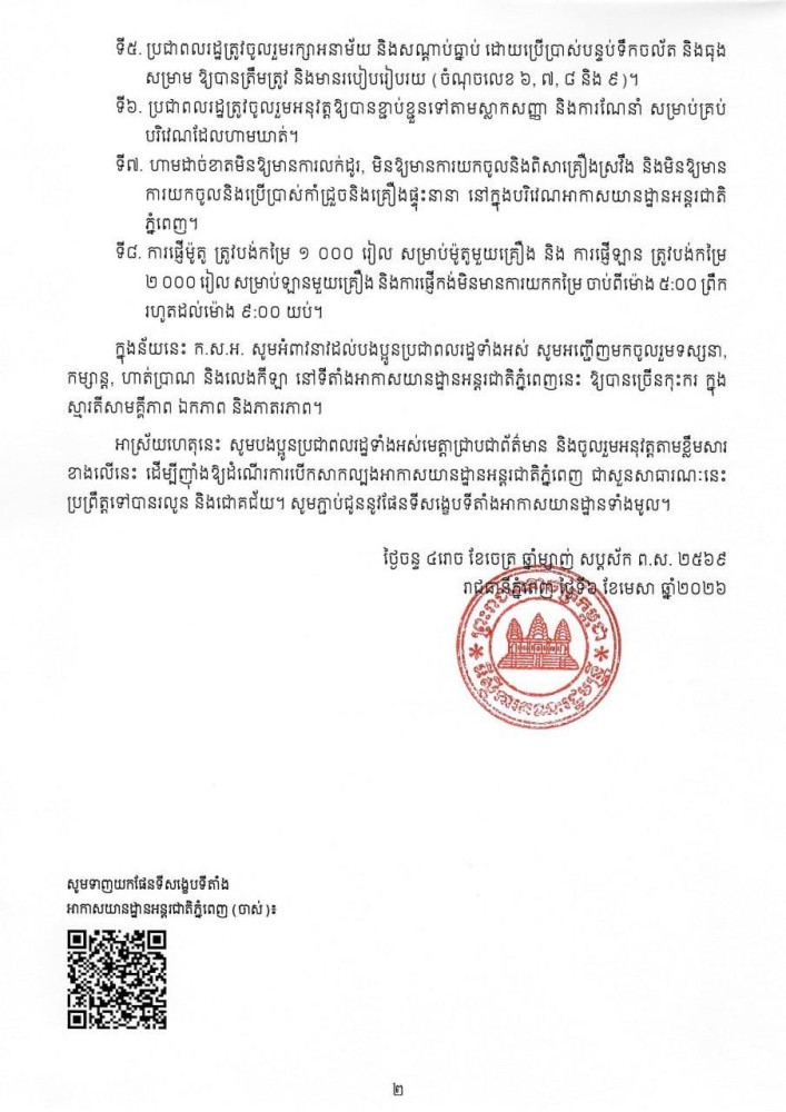សេចក្តីជូនដំណឹង ស្តីពីការបើកដំណើរការសាកល្បង អាកាសយានដ្ឋានអន្តរជាតិភ្នំពេញ (ចាស់) ជាសួនសាធារណៈសម្រាប់សាធារណជនចូលកម្សាន្ត ក្នុងឱកាសបុណ្យចូលឆ្នាំថ្មីប្រពៃណីជាតិខ្មែរ