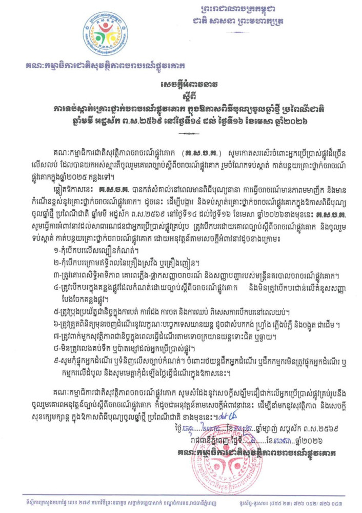 គណៈកម្មាធិការជាតិសុវត្ថិភាពចរាចរណ៍ផ្លូវគោក ចេញសេចក្ដីអំពាវនាវស្ដីពីការទប់ស្កាត់គ្រោះថ្នាក់ចរាចរណ៍ផ្លូវគោក ក្នុងឱកាសពិធីបុណ្យចូលឆ្នាំថ្មីប្រពៃណីជាតិខ្មែរ នាពេលខាងមុខ