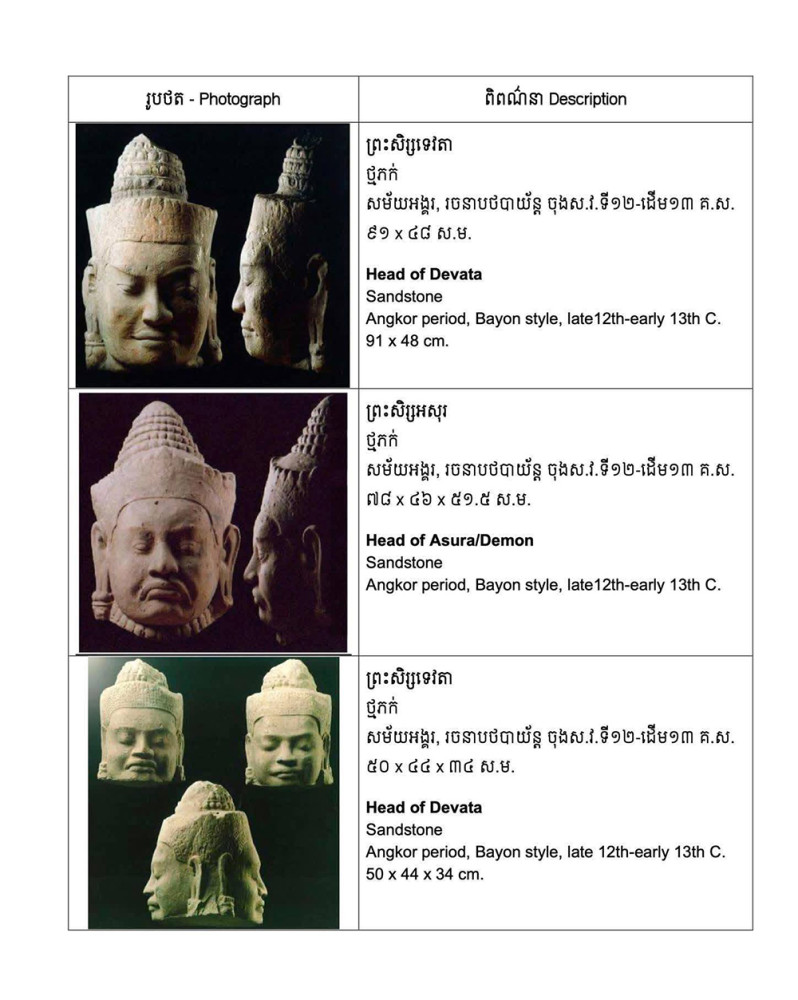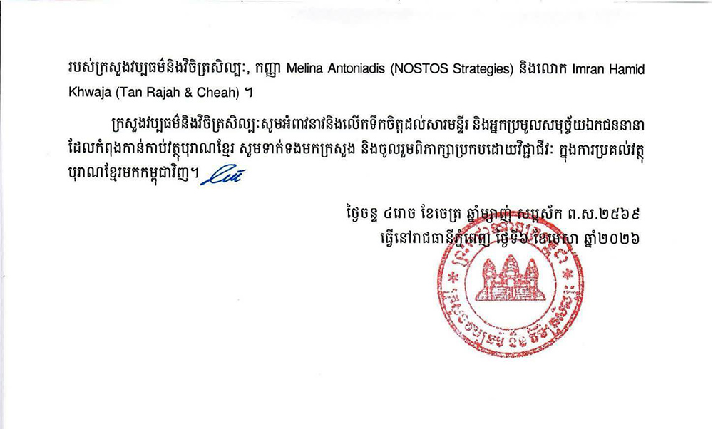 ក្រសួងវប្បធម៌ និងវិចិត្រសិល្បៈ បានអំពាវនាវ និងលើកទឹកចិត្តដល់សារមន្ទីរ និងអ្នកប្រមូលសមុច្ច័យឯកជននានា ដែលកំពុងកាន់កាប់វត្ថុបុរាណខ្មែរ ឱ្យទាក់ទងមកក្រសួង និងចូលរួមពិភាក្សាប្រកបដោយវិជ្ជាជីវៈក្នុងការប្រគល់វត្ថុបុរាណខ្មែរមកកម្ពុជាវិញ៕