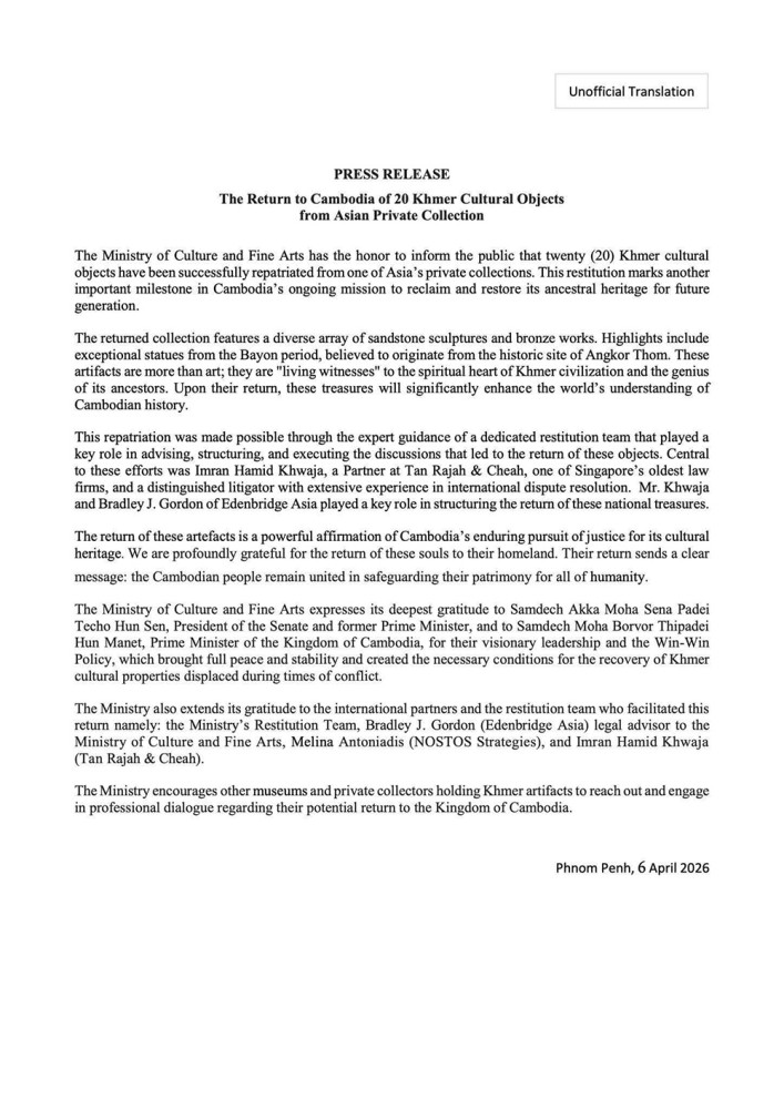 AKP ភ្នំពេញ ថ្ងៃទី០៧ ខែ មេសា ឆ្នាំ ២០២៦ -- យ៉ាងហោចណាស់ វត្ថុបុរាណដ៏មានតម្លៃរបស់ខ្មែរចំនួន ២០រូប ដែលកាន់កាប់ដោយសមុច្ឆ័យដែលជាអ្នកសន្សំឯកជនមួយក្នុងតំបន់អាស៊ី ត្រូវបានបញ្ជូនត្រឡប់មកកាន់កម្ពុជាវិញ។