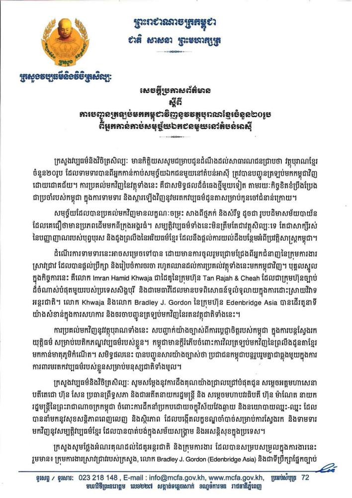បញ្ជូនត្រឡប់មកកម្ពុជាវិញនូវវត្ថុបុរាណខ្មែរ ២០រូប ពីអ្នកកាន់កាប់សមុច្ច័យឯកជនមួយនៅតំបន់អាស៊ី