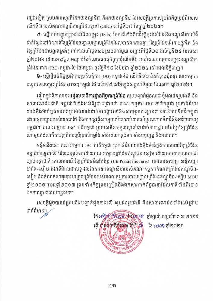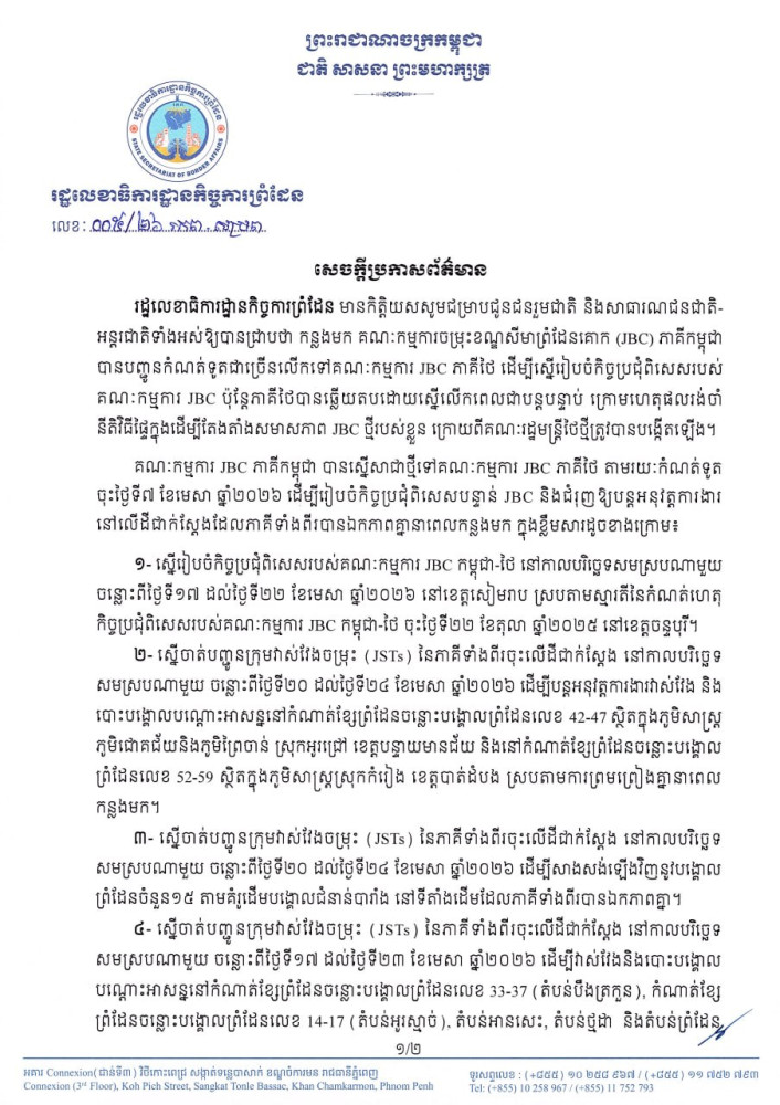 គណៈកម្មការព្រំដែនចម្រុះខណ្ឌសីមាព្រំដែនគោក (JBC) ភាគីកម្ពុជា ស្នើឱ្យមានកិច្ចប្រជុំពិសេសបន្ទាន់ JBC កម្ពុជា-ថៃ នៅក្នុងខែមេសា