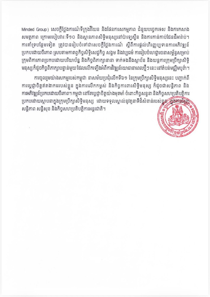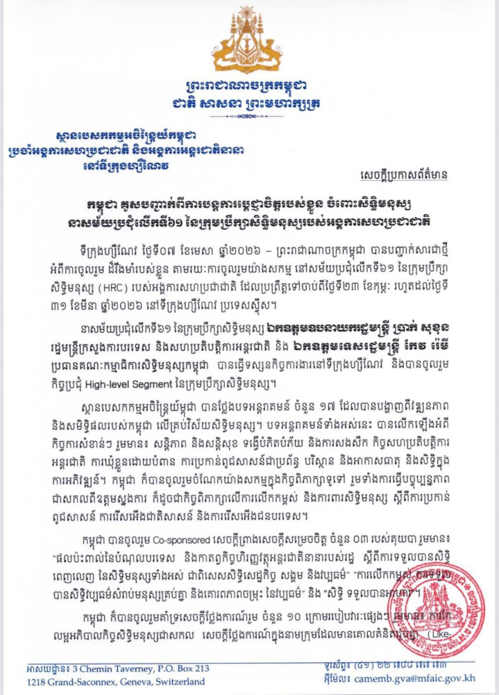 កម្ពុជា គូសបញ្ជាក់ពីការបន្តការប្តេជ្ញាចិត្តរបស់ខ្លួន ចំពោះសិទ្ធិមនុស្ស នាសម័យប្រជុំលើកទី៦១ នៃក្រុមប្រឹក្សាសិទ្ធិមនុស្សរបស់អង្គការសហប្រជាជាតិ