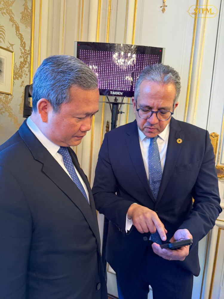 សម្តេចមហាបវរធិបតី ហ៊ុន ម៉ាណែត នាយករដ្ឋមន្ត្រី នៃព្រះរាជាណាចក្រកម្ពុជា អញ្ជើញជួបពិភាក្សាការងារក្រៅផ្លូវការជាមួយ ឯកឧត្តម Duma Gideon Boko ប្រធានាធិបតីបុតស្វាណា ឯកឧត្ដម Akihiko Nishio អនុប្រធានធនាគារពិភពលោក ទទួលបន្ទុកការអភិវឌ្ឍហិរញ្ញវត្ថុ និងលោកសាស្ត្រាចារ្យបណ្ឌិត Khaled EI Enany អគ្គនាយកអង្គការ UNESCO មុនពេលចូលរួមកិច្ចប្រជុំកំពូលស្ដីពីសុខភាពតែមួយ នារសៀលថ្ងៃទី០៧ ខែមេសា ឆ្នាំ២០២៦ (ម៉ោងនៅបារាំង)។