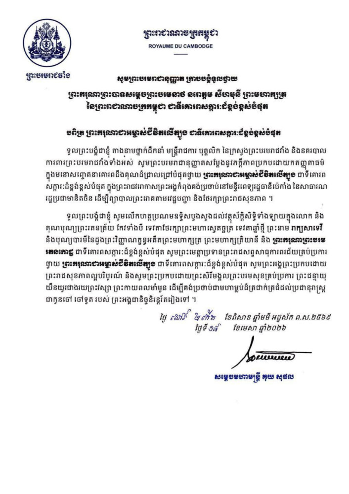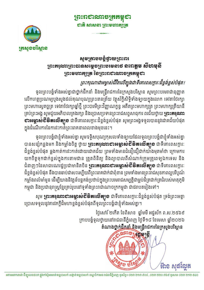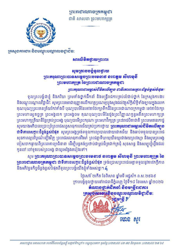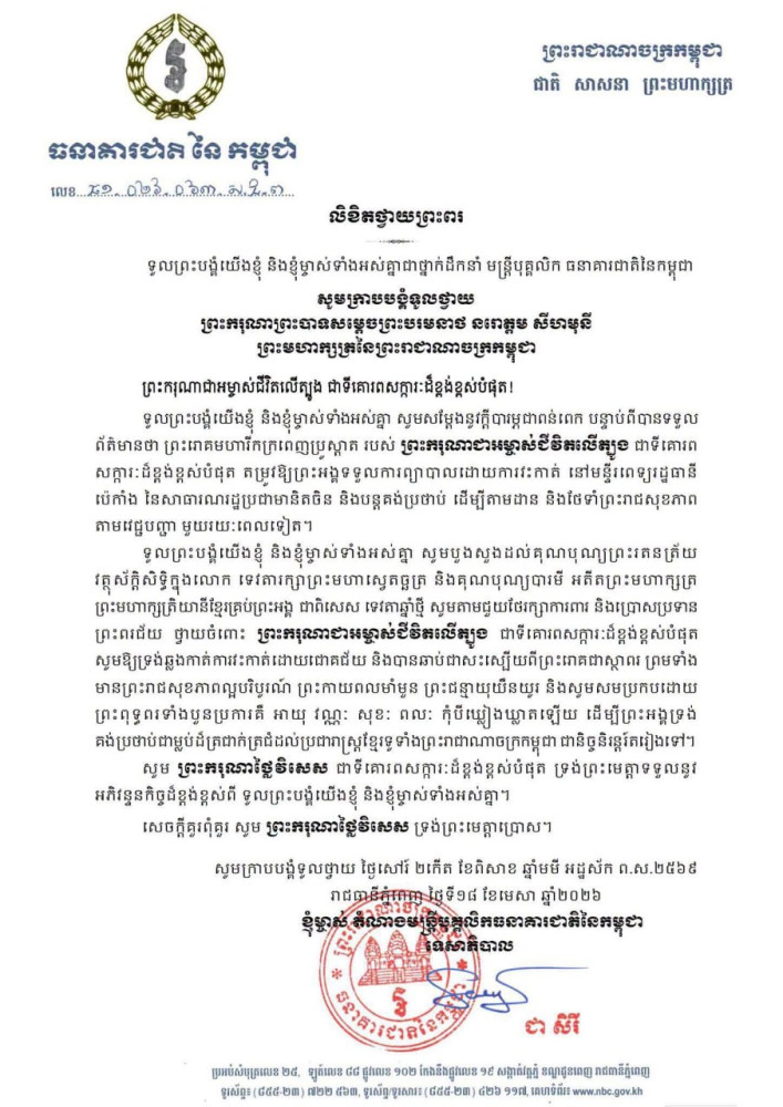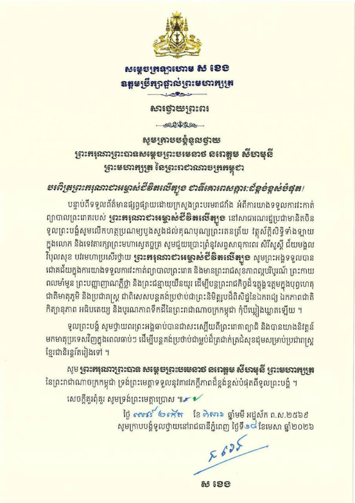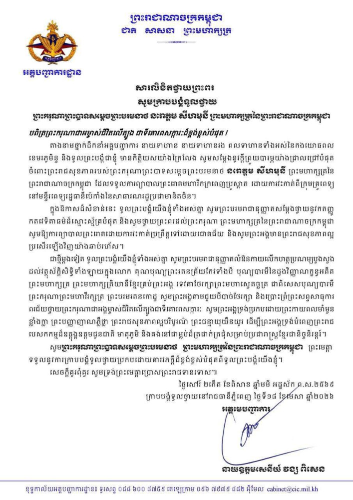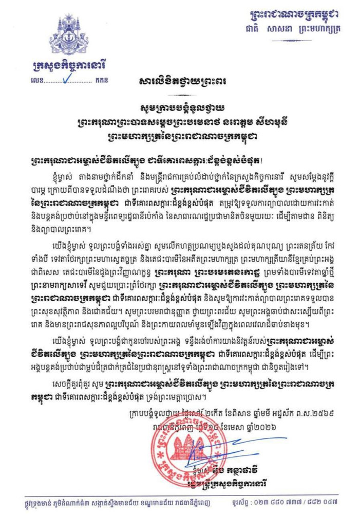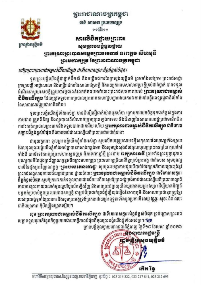 ក្រសួង-ស្ថាប័ននានា ក្រាបបង្គំទូលថ្វាយព្រះពរ ព្រះករុណា ព្រះមហាក្សត្រ សូមទ្រង់បានប្រកបដោយជោគជ័យក្នុងការវះកាត់ព្យាបាលព្រះរោគ នៅមន្ទីរពេទ្យរដ្ឋធានីប៉េកាំង