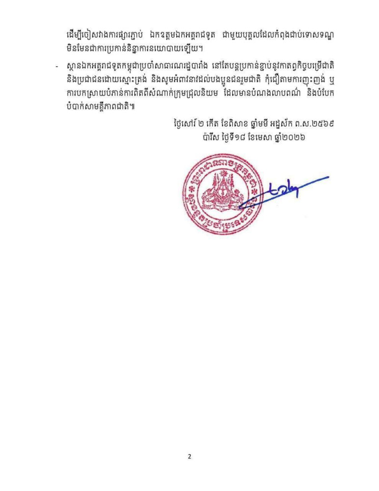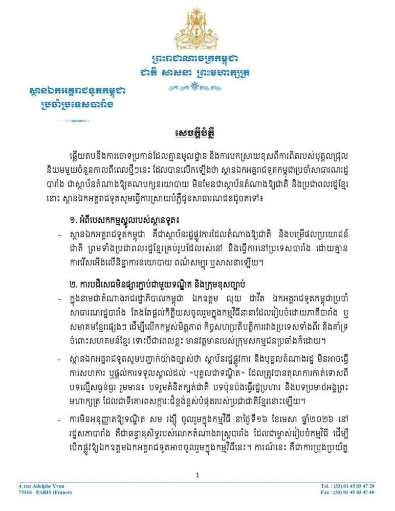 ស្ថានឯកអគ្គរាជទូតកម្ពុជា ប្រចាំប្រទេសបារាំង ច្រានចោលការចោទប្រកាន់ និងការលើកឡើងគ្មានមូលដ្ឋានរបស់ក្រុមជ្រុលនិយម