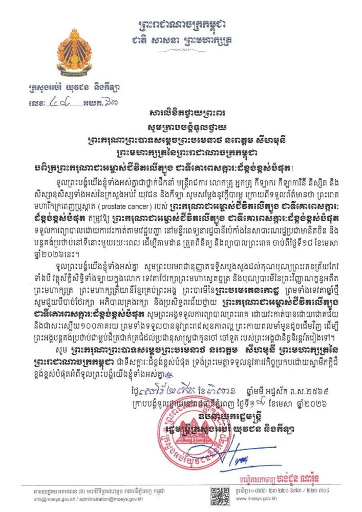 ថ្នាក់ដឹកនាំ មន្ត្រីរាជការ លោកគ្រូ អ្នកគ្រូ កីឡាករ កីឡាការិនី និស្សិត និងសិស្សានុសិស្សទាំងអស់នៃក្រសួងអប់រំ យុវជន និងកីឡា បានសម្តែងនូវក្តីបារម្ភ ក្រោយពីទទួលព័ត៌មានថា ព្រះរោគមហារីកក្រពេញប្រូស្តាត (prostate cancer) របស់ព្រះករុណាជាអម្ចាស់ជីវិតលើត្បូងជាទីគោរពសក្ការៈដ៏ខ្ពង់ខ្ពស់បំផុត ដែលតម្រូវឱ្យព្រះអង្គទទទួលការព្យាបាលដោយការវះកាត់តាមវេជ្ជបញ្ជា នៅមន្ទីរពេទ្យនារដ្ឋធានីប៉េកាំង នៃសាធារណរដ្ឋប្រជាមានិតចិន និងបន្តគង់ប្រថាប់នៅទីនោះមួយរយៈពេល ដើម្បីតាមដាន ត្រួតពិនិត្យ និងព្យាបាលព្រះរោគ ចាប់ពីថ្ងៃទី១៨ ខែមេសា ឆ្នាំ២០២៦។