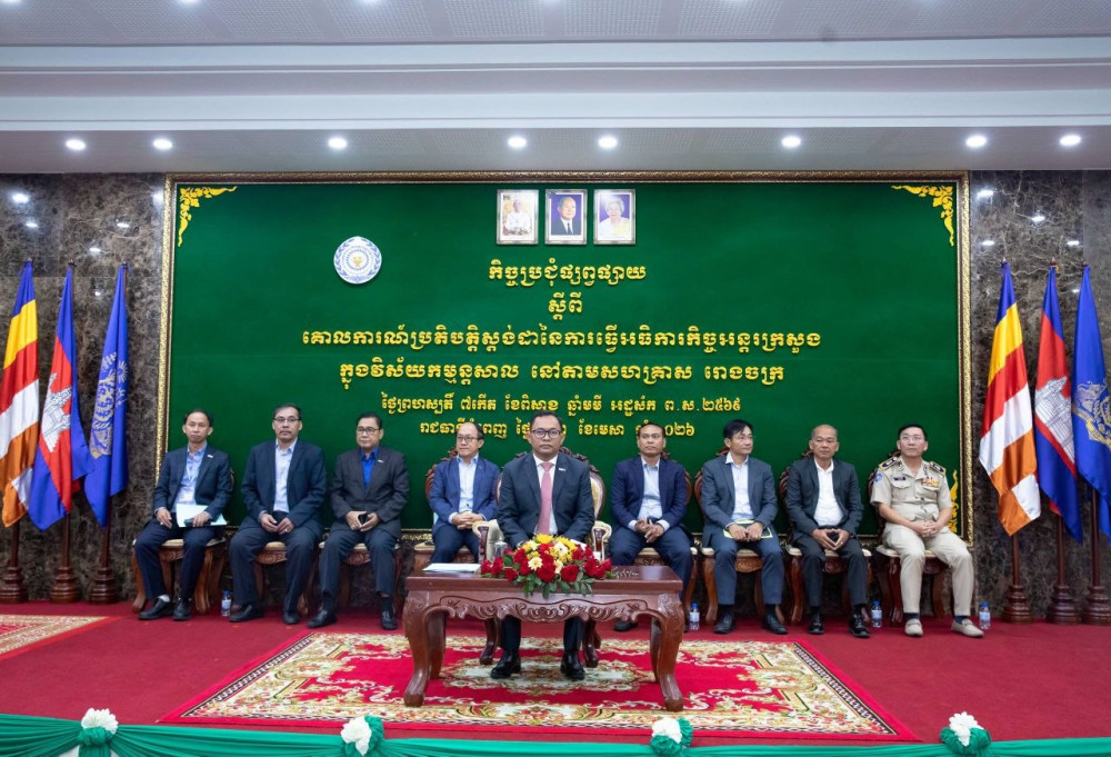 AKP ភ្នំពេញ ថ្ងៃទី២៤ ខែមេសា ឆ្នាំ២០២៦--ក្រសួងការងារ និងបណ្តុះបណ្តាលវិជ្ជាជីវៈ បានរៀបចំកិច្ចប្រជុំផ្សព្វផ្សាយស្តីពី «គោលការណ៍ប្រតិបត្តិស្ដង់ដានៃការធ្វើអធិការកិច្ចអន្ដរក្រសួងក្នុងវិស័យកម្មន្ដសាល» នៅតាមសហគ្រាស រោងចក្រ នៅថ្ងៃទី២៣ ខែមេសា ឆ្នាំ២០២៦ ក្រោមអធិបតីភាពឯកឧត្តម សោម ចំណាន រដ្ឋលេខាធិការ តំណាងឯកឧត្តម ហេង សួរ រដ្ឋមន្ត្រីក្រសួង ការងារ និងបណ្តុះបណ្តាលវិជ្ជាជីវៈ និងជាប្រធានក្រុមការងាររៀបចំក្រុមអធិការកិច្ចអន្តរក្រសួង។