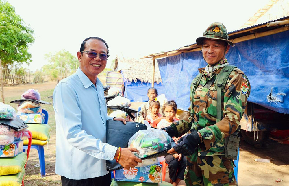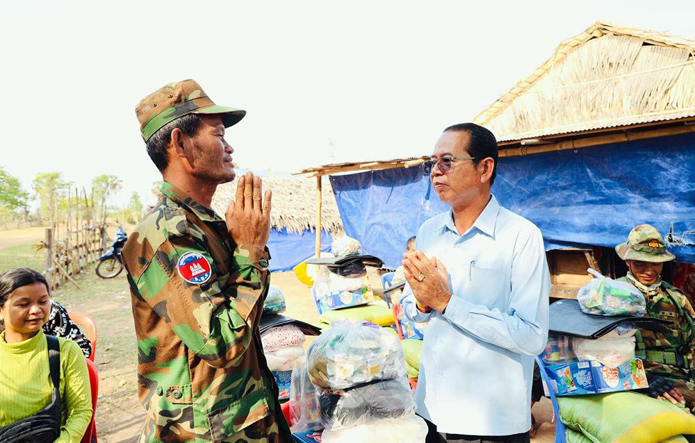 AKP កំពង់ធំ ថ្ងៃទី២៤ ខែមេសាឆ្មាំ២០២៦--លោកសាយ គឹមឡម អភិបាលស្រុកស្ទោងបានលើកទឹកចិត្តដល់អាជ្ញាធរមូលដ្ឋាននិងពលរដ្ឋត្រូវបន្តពហិកាទំនិញប្រទេសសៀមក្នុងឱកាសដែលលោកអញ្ជើញចុះជួបសំណេះសំណាលសួរសុខទុក្ខនិងឧបត្ថម្ភស្បៀងដល់គ្រួសារកងទ័ពនិងជនភៀសសឹកដែលកំពុងបន្តស្នាក់នៅក្នុងភូមិប្រាសាទ ឃុំចំណាលើស្រុកស្ទោងខេត្តកំពង់ធំនាព្រឹកថ្ងៃទី២៤ខែមេសាឆ្នាំ ២០២៦។