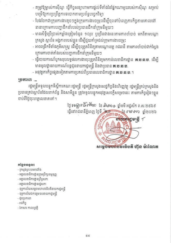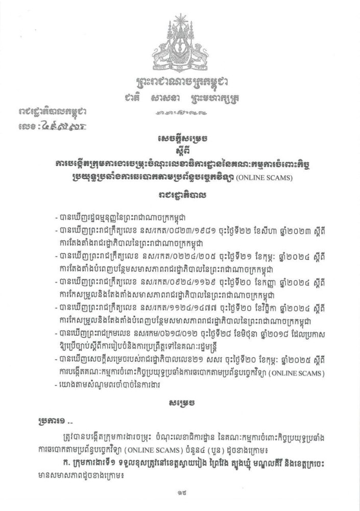 នេះបើតាមសេចក្តីសម្រេចស្តីពីការបង្កើតក្រុមការងារចម្រុះចំណុះលេខាធិការដ្ឋាននៃគណៈកម្មកាចំពោះកិច្ចប្រយុទ្ធប្រឆាំងការឆបោកតាមប្រព័ន្ធបច្ចេកវិទ្យា(ONLINE SCAMS)។