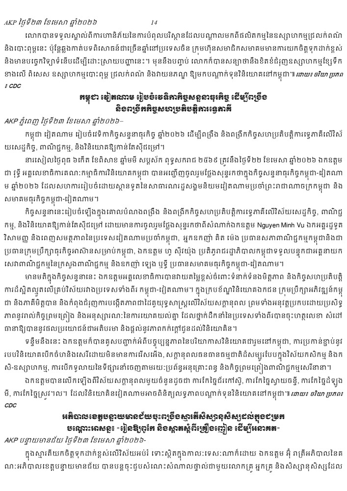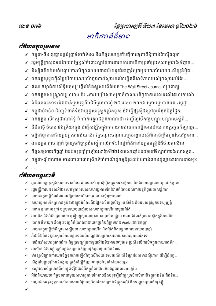 ព្រឹត្តិប័ត្រព័ត៌មានចេញផ្សាយសម្រាប់ថ្ងៃព្រហស្បតិ៍ ទី២៣ ខែមេសា ឆ្នាំ២០២៦