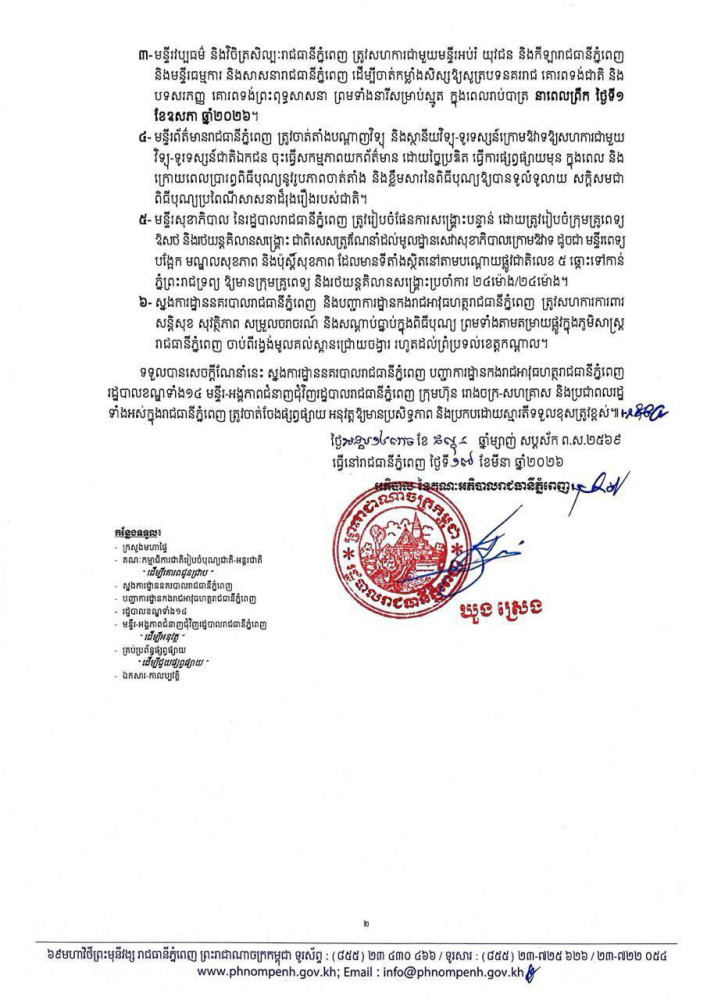 AKP ភ្នំពេញ ថ្ងៃទី២៩ ខែមេសា ឆ្នាំ២០២៦--រដ្ឋបាលរាជធានីភ្នំពេញ បានណែនាំឱ្យអាជ្ញាធរខណ្ឌទាំង១៤ តុបតែង និងដាក់ទងជាតិ សាសនា នៅមុខផ្ទះ ទង់ព្រះមហាក្សត្រ និងចងបដាពាក្យស្លោកនៅតាម វត្តអារាម អគារសាធារណៈ អគារពាណិជ្ជកម្ម ផ្សារ សំណង់បុរី ក្រុមហ៊ុន រោងចក្រ-សហគ្រាស រមណីយដ្ឋាន មជ្ឈមណ្ឌលកម្សាន្ត និងគ្រប់គេហដ្ឋានប្រជាពលរដ្ឋ ដើម្បីអបអរសាទរពិធីបុណ្យប្រពៃណីសាសនានេះ ឱ្យប្រព្រឹត្តទៅប្រកបដោយកិត្តិយស និងថ្លៃថ្នូរ ស្របតាមរដ្ឋធម្មនុញ្ញនៃព្រះរាជាណាចក្រកម្ពុជា។