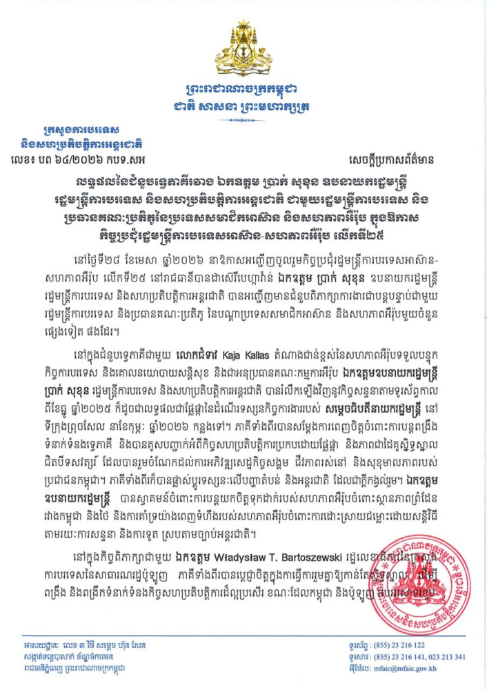 លទ្ធផលនៃជំនួបទ្វេភាគីរវាង ឯកឧត្តម ប្រាក់ សុខុន ឧបនាយករដ្ឋមន្ត្រី ជាមួយរដ្ឋមន្ត្រីការបរទេស និងប្រធានគណៈប្រតិភូនៃប្រទេសសមាជិកអាស៊ាន និងសហភាពអឺរ៉ុប ក្នុងឱកាសកិច្ចប្រជុំរដ្ឋមន្ត្រីការបរទេសអាស៊ាន-សហភាពអឺរ៉ុប លើកទី២៥