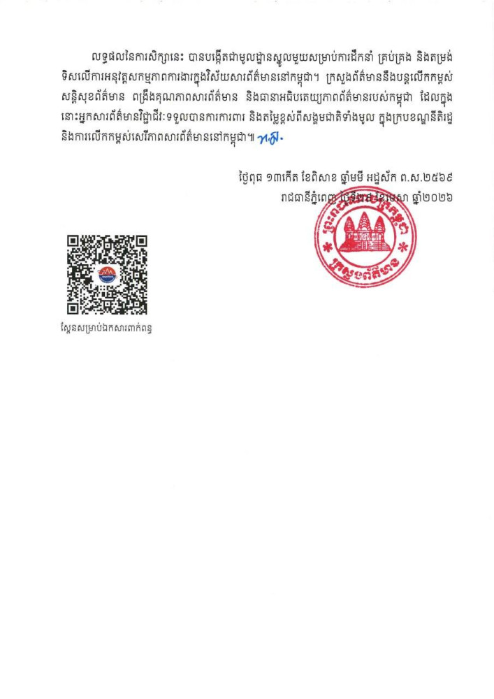 សេចក្តីប្រកាសព័ត៌មាន ស្តីពីការផ្សព្វផ្សាយរបាយការណ៍ «ស្ថានភាពសេរីភាពសារព័ត៌មាននៅកម្ពុជា ឆ្នាំ២០២៦»