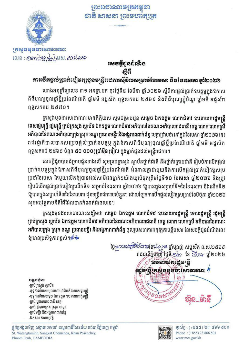 សេចក្តីជូនដំណឹង ស្តីពីការបើកផ្តល់ប្រាក់បៀវត្សជូនមន្ត្រីរាជការស៊ីវិលសម្រាប់ខែមេសា និងខែឧសភា ឆ្នាំ២០២៦ និងប្រាក់ឧបត្ថម្ភ ក្នុងឱកាសពិធីបុណ្យចូលឆ្នាំថ្មីប្រពៃណីជាតិ ៥០ ០០០រៀល ក្នុងម្នាក់ជូនដល់មន្ត្រីរាជការ