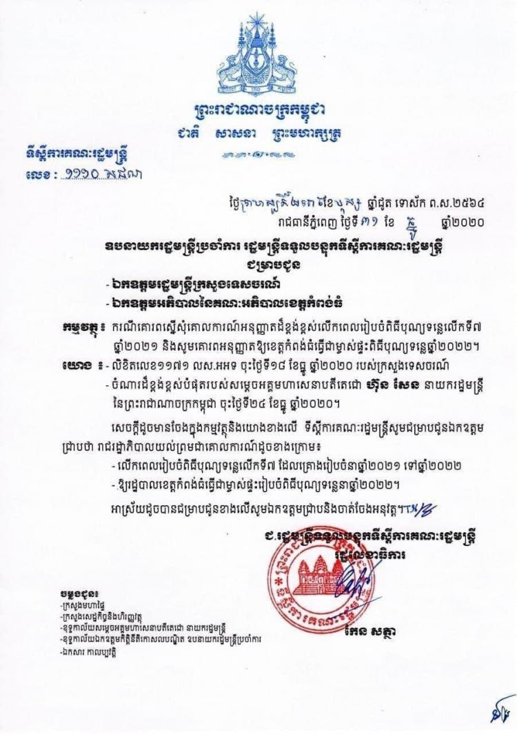 ពិធីបុណ្យទន្លេលើកទី៧ ឆ្នាំ២០២១ នៅខេត្តកំពង់ធំត្រូវលើកពេល ទៅរៀបចំនៅឆ្នាំ២០២២ វិញ