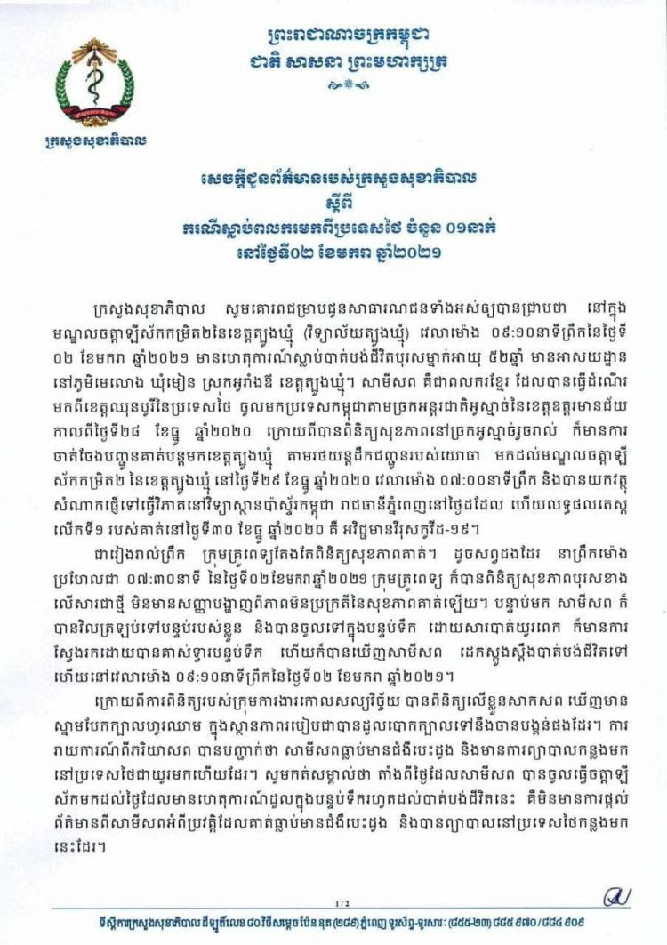 ក្រសួងសុខាភិបាល ជូនដំណឹង ពីករណីស្លាប់ពលករខ្មែរម្នាក់ ដែលកំពុងចត្តាឡីស័ក ដោយមូលហេតុរអិលជើងដួលក្នុងបន្ទប់ទឹក