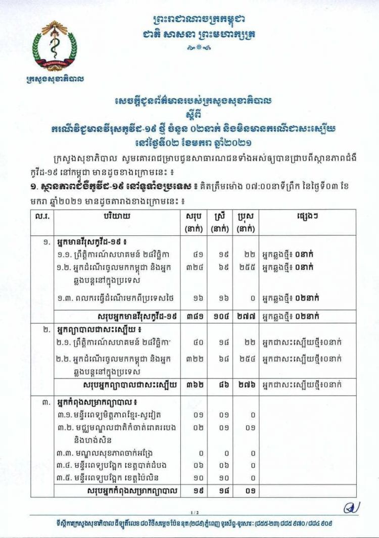 មានករណីវិជ្ជមានកូវីដ-១៩ ថ្មី ចំនួន ០២នាក់ និងមិនមានករណីជាសះស្បើយនោះទេ គិតត្រឹមព្រឹកនេះ