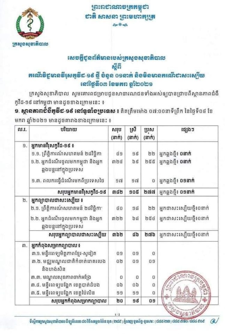 រកឃើញករណីវិជ្ជមានកូវីដ-១៩ លើពលករធ្វើដំណើរមកពីប្រទេសថៃម្នាក់ទៀត និងមិនមានករណីជាសះស្បើយថ្មីទេ